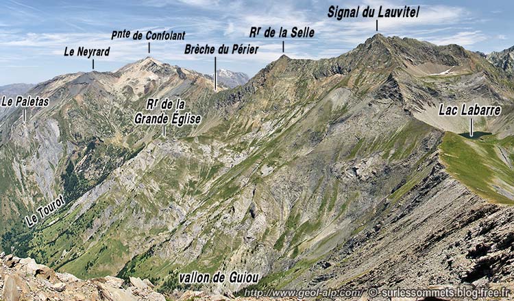 Du côté sud du cirque de la Selle, le cristallin des crêtes du Signal de Lauvitel, à la différence de celui de la Brèche du Périer (voir la page "Lauvitel"), ne montre pas de chapeau sédimentaire (hormis, plus au sud, le lambeau coincé à la brèche du Lauvitel).