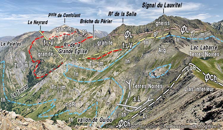 Les crêtes du haut vallon de Confolens (sources du torrent du Tourot) : vue d'ensemble depuis le sommet la Tête des Chétives (cliché original obligeamment communiqué par l'auteur du site "Sur les Sommets"). f.LV = faille du lac du Vallon ; ØL = chevauchement du Signal de Lauvitel ; s.L = synclinal du lac Labarre ; ØCh = chevauchement des Chétives. Tr.-jm = Trias à Jurassique moyen (partie haute passant latéralement aux Terres Noires) ; c.pR : calcaires du Petit Renaud (niveau reposant sur le Lias inférieur). voir l'analyse stratigraphique plus détaillée au cliché suivant. |
