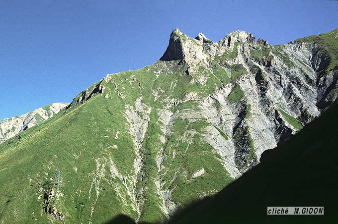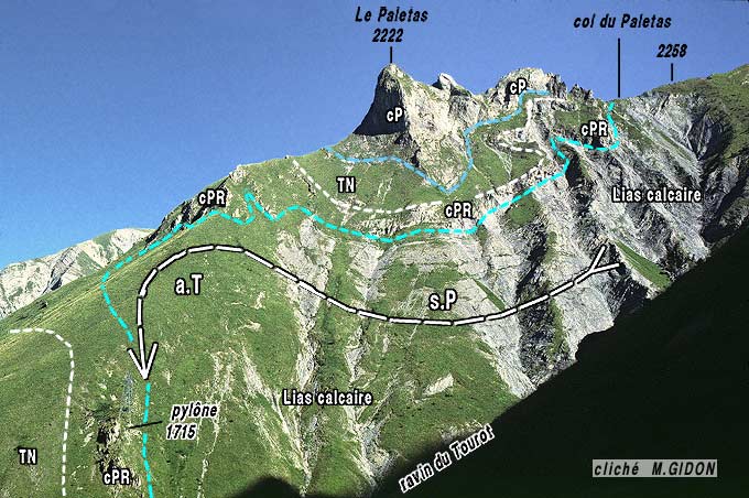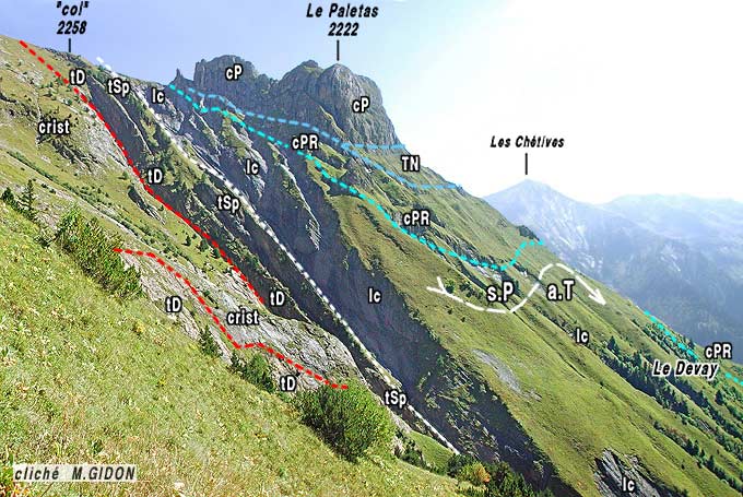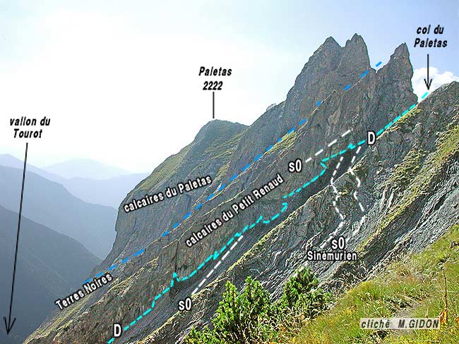 ![]() Détail du versant oriental de la crête sommitale du Paletas vu de l'est, depuis les lacets supérieurs du sentier du col du Paletas (versant de La Selle) On distingue le plongement vers le sud-est de la surface de base des calcaires du Petit Renaud (en vert) et sa discordance angulaire (D), vis à vis des bancs du Lias sous-jacent, plus redressés (s0 = surfaces de strates). |