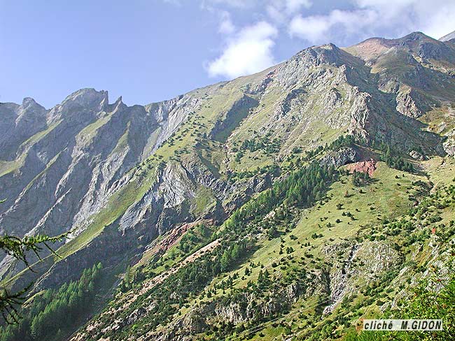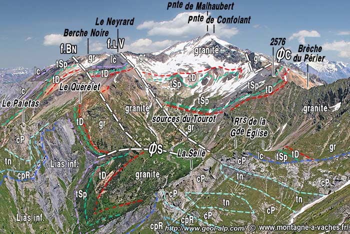Ce tégument triasique du flanc est du synclinal du Paletas est de nouveau présent en placages dans les plus hautes pentes du cirque, au nord de la Brèche du Périer, où l'arrondi de la demi voûte dessinée par la surface du socle cristallin du Rochail lui confère un pendage subhorizontal. Sur la crête, au nord de ce col, ces affleurements triasiques sont chevauchés et rebroussés en crochon sous le cristallin de la Pointe de Confolens (voir également le cliché du haut de page et la page "Lauvitel").
