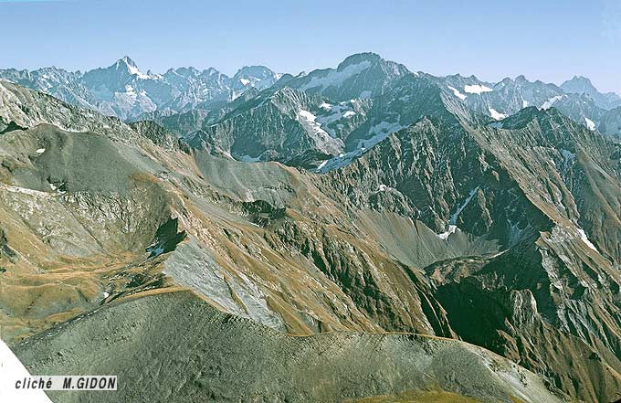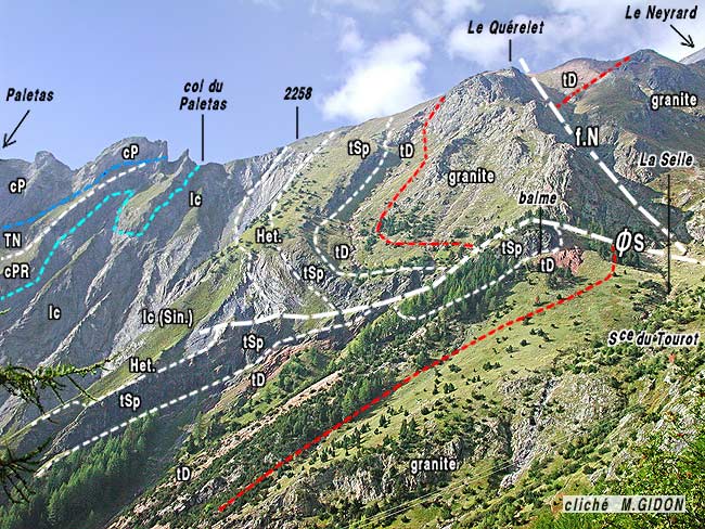 ![]() Le versant est de la crête Paletas - Neyrard vue du nord, depuis les pentes du haut vallon du Tourot, sous la cabane de La Selle (sentier de la Brèche du Périer, alt. 1900) (ce cliché montre la suite vers l'est du précédent mais sous un tout autre angle). La rive droite du ravin du Tourot (arête du Paletas - Neyrard) montre le déversement vers l'ouest, en demi voûte anticlinale, du cristallin du Rochail ainsi sue la faille extensive jurassique du Neyrard (f.N), satellite du côté ouest de la faille du Lac du Vallon (voir la page). ØS = chevauchement de la Selle (accident compressif mineur affectant le socle cristallin) tirets rouges = surface de la pénéplaine anté-triasique ; tirets verts = surface de discordance des calcaires du Petit Renaud sur le Lias inférieur calcaire ; tirets bleus = surface de base des calcaires du Paletas. |