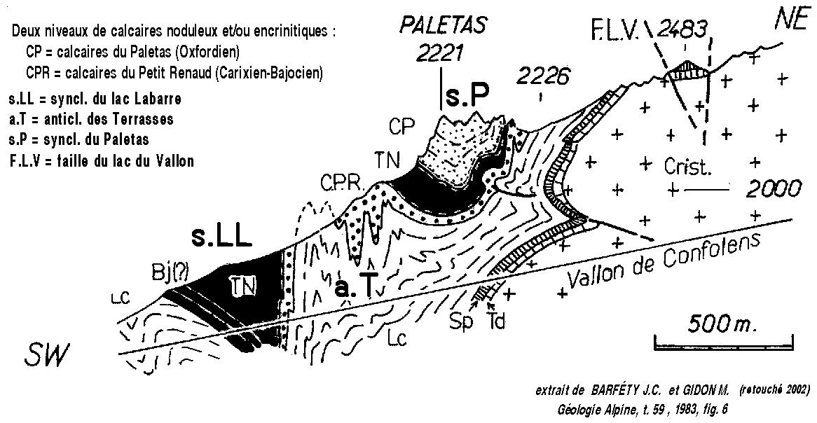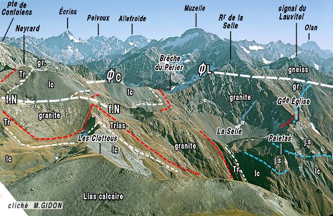 ![]() La partie méridionale du chaînon du Rochail dans les hautes pentes du vallon de Confolens (cirque de la Selle), vue d'avion depuis l'aplomb des Clottous (dont les échines, formées de calcaires liasiques, sont visibles en premier plan) La surface du cristallin du bloc basculé secondaire des Clottous plonge vers la droite et s'enfonce sous le sédimentaire du synclinal du Lac Labarre (surface de la pénéplaine anté-triasique en rouge) : on y distingue les falaises plus claires de calcaires du Jurassique supérieur du Paletas (base soulignée de bleu) et (à l'extrême droite) le talus marneux de Terres Noires du coeur de ce synclinal. f.N = faille extensive du Neyrard (satellite de celle du Lac du Vallon, qui passe en arrière du sommet du Neyrard) ; ØC = chevauchement de la pointe de Confolens ; ØL = chevauchement du signal du Lauvitel (prolongement méridional du précédent). j.s = calcaires du Jurassique supérieur (calcaires du Paletas et du Petit Renaud). |