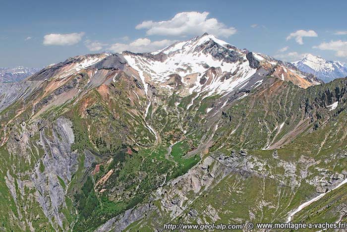 ![]() Le versant sud-ouest du chaînon du Rochail (cirque de la Selle), vu du sud depuis la Tête des Chètives (= Tête de Rame) (cliché original obligeamment communiqué par l'auteur du site "www.montagne-a-vaches.fr/"). a) failles extensives d'âge jurassique (voir à leur sujet la page "Lac du Vallon"): f.BN = faille de Berche Noire ; f.LV = faille du lac du Vallon ; b) failles de chevauchement d'âge plus récent : ØS = chevauchement de la Selle ; ØC = chevauchement de la Pointe de Confolant. |