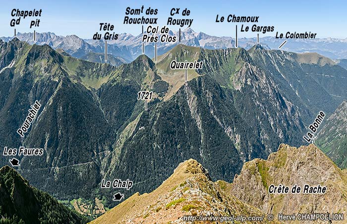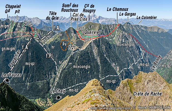 ![]() La rive gauche du Bas Valjouffrey, entre les transversales de La Chapelle et des Faures, vue du sommet de la crête du Rache (cliché original obligeamment communiqué par Mr. H. Champollion, extrait de son ouvrage "VALJOUFFREY", Éditions Terres Neuves). f.A = faille principale du linéament d'Aspres-lès-Corps ; f.Pl = faille des Pleynets. Formations appartenant au noyau cristallin : "gr" = granite ; "gn.migm" = gneiss très migmatitiques ; "ms-chl" = micaschistes chloriteux. Formations appartenant à la série "corticale" du massif cristallin : "ms+conglo" = micaschistes et conglomérats métamorphiques ; "ms-qz" = micaschistes quartzeux. |