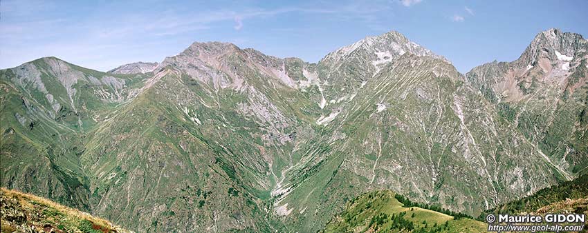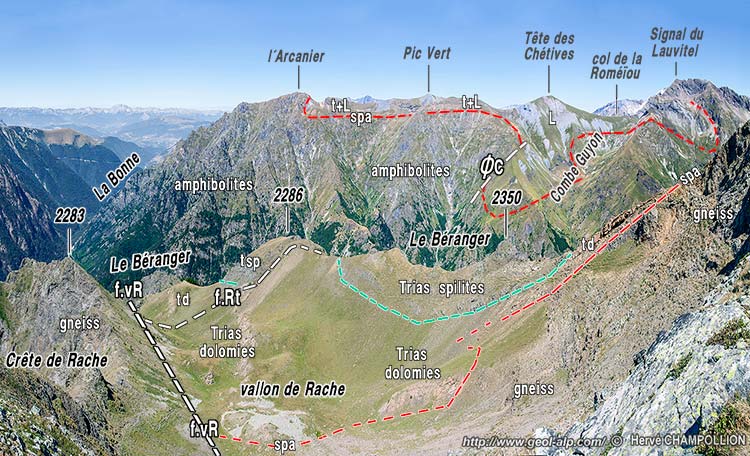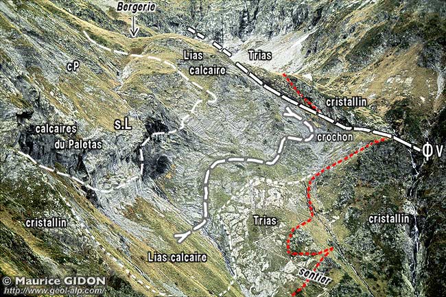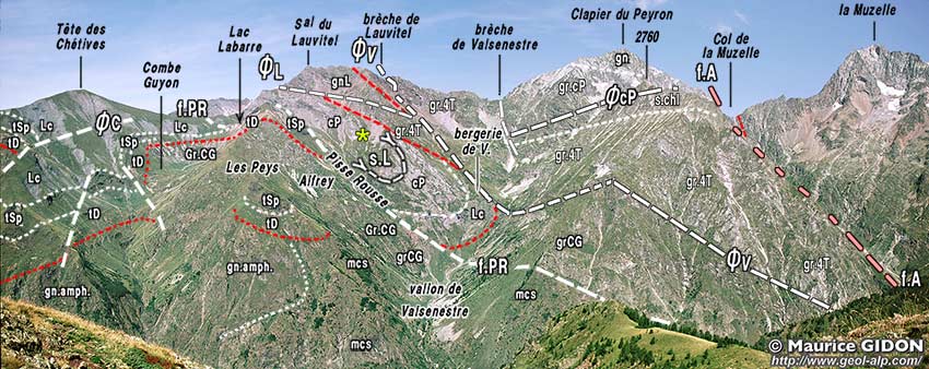![]() La rive droite du torrent de Béranger, à la hauteur du village de Valsenestre vue du sud, depuis la brèche de Rache (2350), sur l'arête ouest du Pic de Valsenestre. ØC = chevauchement des Chétives ; s.L = synclinal du Lac Labarre ; f.PR = faille de Pisse-Rousse ; ØL = chevauchement du signal de Lauvitel ; ØV = chevauchement de Valsenestre ; ØcP = chevauchement du Clapier du Peyron ; f.A = faille d'Aspres-lès-Corps. gr.4T = granite des Quatre Tours ; grCG = granite monzonitique* de Combe Guyon ; gr.cP = granite du Clapier du Peyron ; gnL = gneiss du type Lavey ; s.chl = micaschistes chloriteux. CP = calcaires du Paletas (Jurassique supérieur), discordants* sur les termes de plus en plus âgés, jusque sur le cristallin, du SW vers le NE. L'astérisque jaune-vert indique l'emplacement du cliché d'affleurement de la page "Lac Labarre". (en premier plan : placages triasiques de l'échine 2155, à l'ouest de Combe Oursière). |