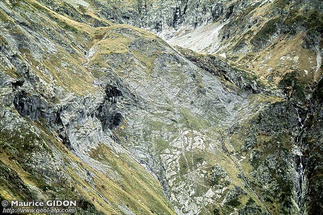 ![]() Les cascades de la bergerie de Valsenestre, vues du sud-ouest, depuis les pentes d'Alfrey. s.L = synclinal du Lac Labarre ; ØV = chevauchement de Valsenestre. |