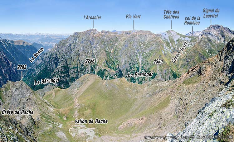 Le cours de ce dernier torrent s'est en effet enfoncé très profondément dans le socle cristallin de la marge occidentale du massif du Pelvoux et les témoins de la couverture sédimentaire qui prolongeaient originellement ceux de l'Arcanier ne se rencontrent, en rive sud, que haut sur les crêtes occidentales du Pic de Valsenestre (Crête de Rache au sud et hautes pentes de Combe Oursière au nord).