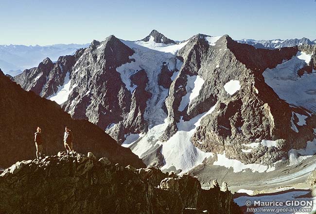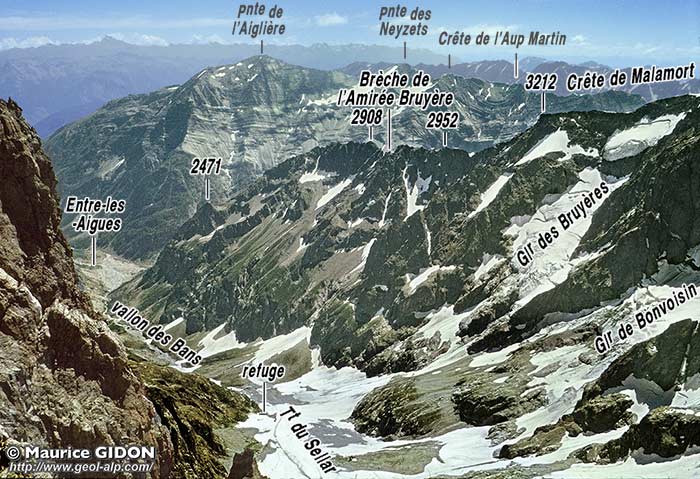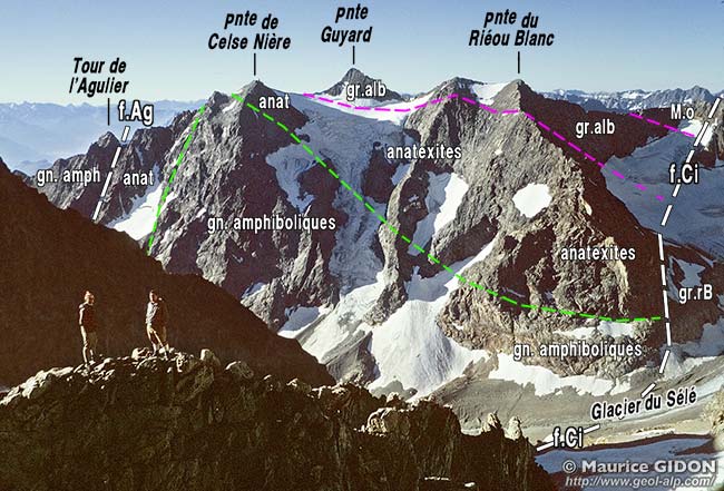 Sur ce versant, à la différence de la vallée du glacier Noir ou de la vallée de La Bérarde le cirque du Sélé n'entaille pas assez profondément la chape gneissique du massif pour mettre à nu le pluton* granitique qui prolonge vers le sud celui de La Bérarde. Il est seulement atteint par une petite ouverture, entre la Pointe du Sélé et les Pics d'Ailefroide et par celle du glacier du Coup de Sabre.