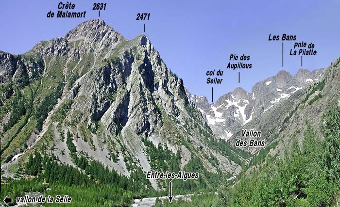 B/ Le Vallon des Bans converge avec celui de la Selle à Entre-les-Aigues, à peu de distance de crêtes de La Blanche au NE et de L'Aiglière au SE, où le socle cristallin disparaît sous la couverture transgressive du Nummulitique autochtone.