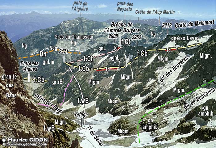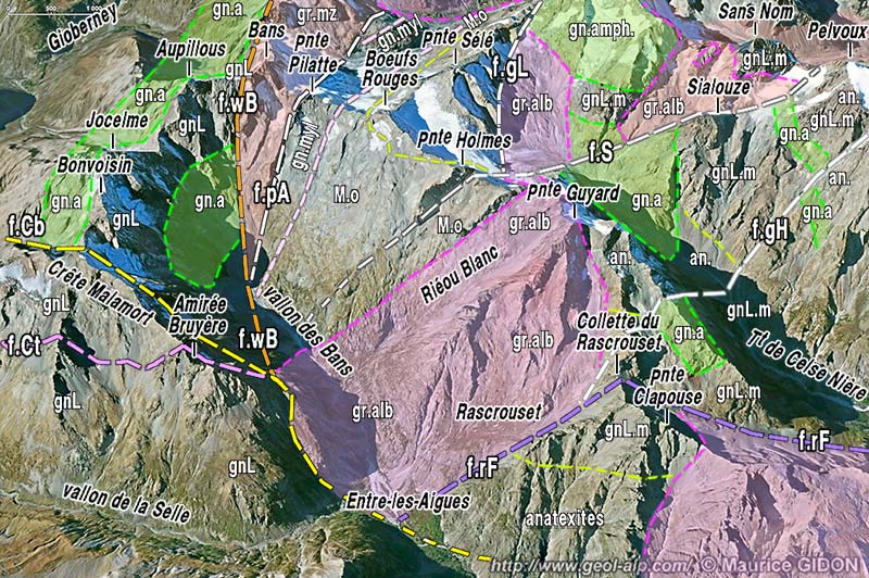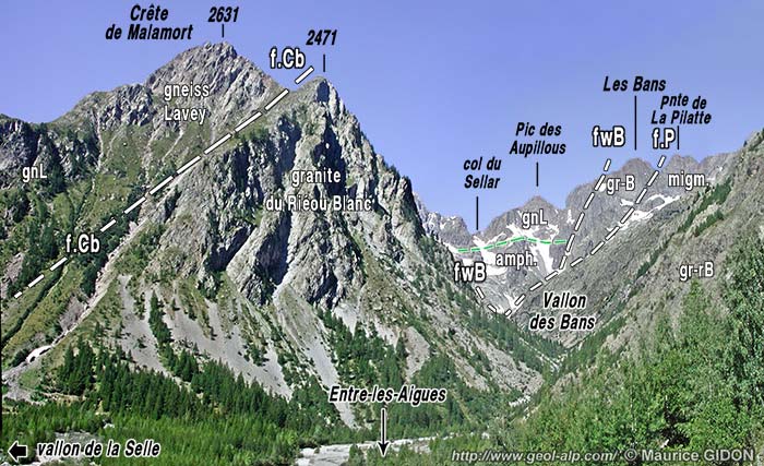 En outre c'est là qu'aboutit, en se connectant à angle aigu avec la faille de Malamort, la faille occidentale des Bans ; cette dernière suit, plus en amont, le vallon des Bans en tranchant toutes les bandes d'affleurements, orientées presque N-S, de la rive gauche (septentrionale) de ce haut vallon, notamment celle des gneiss de Peyre Arguet et le pluton* granitique du Riéou Blanc (qui forme la Pointe Guyard) : comme des bandes ne se poursuivent nulle part au sud du vallon le décalage de cette faille ne peut guère être que sénestre et/ou comporter un très fort rejet de soulèvement de sa lèvre nord.