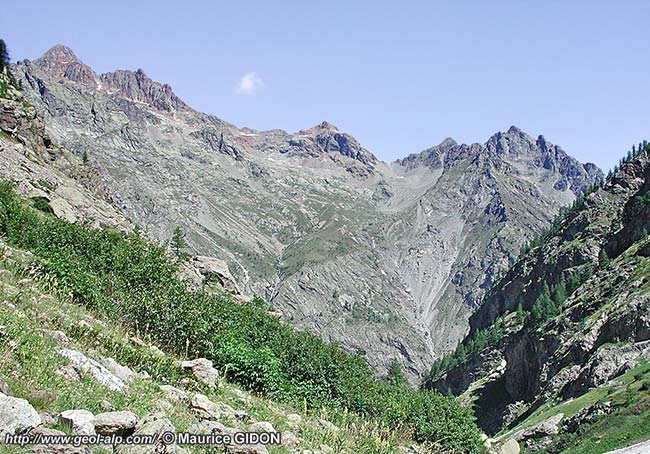 Le dispositif de fracture ainsi généré s'intègre dans un système de déformation par le jeu d'une mosaïque de blocs de socle qui ont coulissé les uns par rapport à aux autres. Ce système, qui caractérise la partie sud du massif cristallin du Pelvoux, est examiné, dans son ensemble et dans ses rapports avec son environnement, à la page "Tectonique du Massif du Pelvoux". |