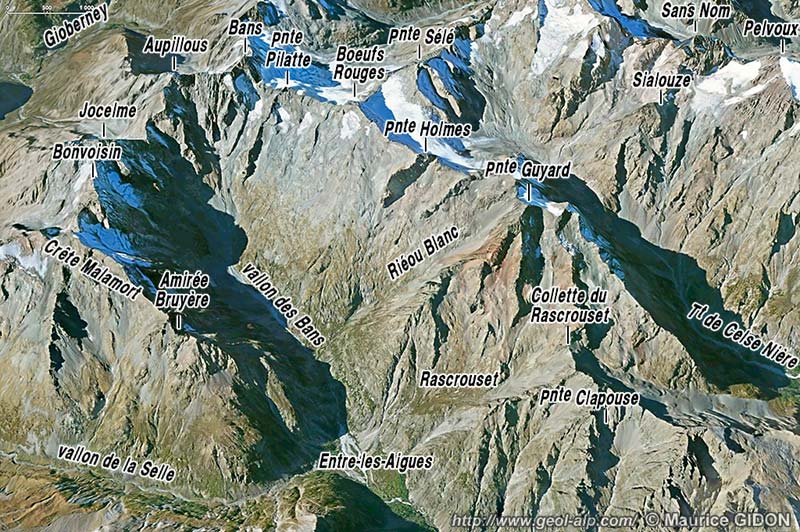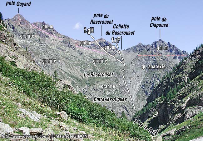 La localité d'Entre-les-Aygues se trouve en fait au confluent de trois vallons : ceux des Bancs à l'ouest, du Rascrouset au nord et de la Selle au sud. Au point de vue structural elle correspond à un véritable "nœud de fractures". En effet c'est là qu'aboutit d'abord la faille du Rascrouset, prolongement méridional de celle du Rif du Fraysse (voir la page "Ailefroide"), laquelle ne se prolonge pas directement plus au sud, mais trouve son équivalent, décalé de 2 km vers l'ouest, dans la faille de Chanteloube qui détermine la brèche de l'Amirée Bruyère (à l'ouest du piton 2908 de la crête de Malamort), du côté sud du vallon des Bans (voir plus haut , ainsi que la page "Rouite").