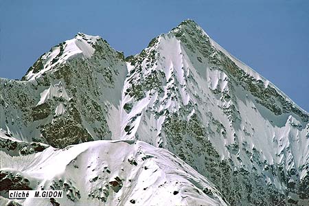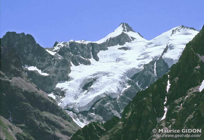 Le Pic du Glacier Blanc et le Pic de Neige Cordier vus de l'est - nord-est, depuis la Roche Chevalière