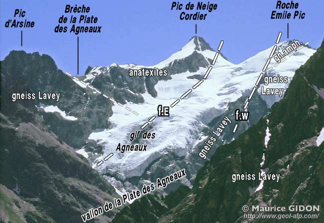 de la Plate des Agneaux mais ne déborde guère à l'ouest du col Emile Pic et du glacier des Agneaux, qui en descend vers le nord : cette ligne de faiblesse, dans les abrupts qui tombent sur le vallon de la Plate des Agneaux, est déterminée par le passage d'un faisceau de failles qui prolonge vers le nord celui que suit le cours aval du Glacier Blanc.
