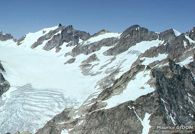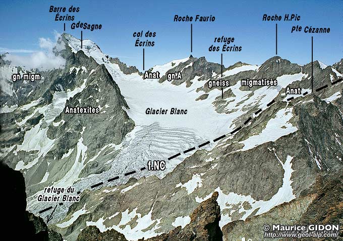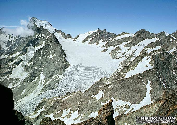 La crête méridionale, de la Barre Blanche et de la Grande Sagne, qui limite cette vallée glaciaire est entaillée plus profondément, du côté sud, par la vallée du Glacier Noir et plus dégarnie de couverture neigeuse en raison de son exposition au sud. Cette entaille montre bien cette structure mais, malgré ses 1500 m de dénivelée, elle n'est pas assez profonde pour mettre à nu en rive septentrionale le toît du pluton* granitique qui forme, plus au sud, le soubassement du Pelvoux (à la Bosse de la Momie).