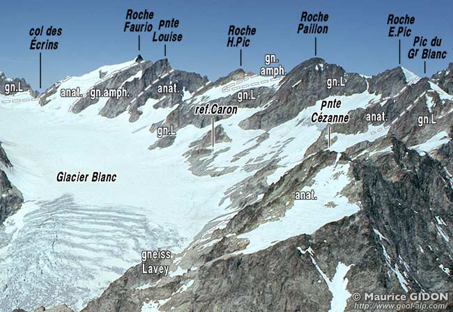 À la Roche Faurio le petit appareil glaciaire qui couvre le versant sud de la crête est installé sur un panneau d'anatexites, allongé N-S et de largeur kilométrique, que limitent, du côté ouest, les gneiss de type Lavey de la Roche d'Alvau (c'est dans cette même bande rocheuse que, dans les abrupts nord de la montagne, se loge aussi le glacier de Tombe Murée).