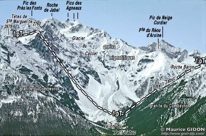 Le très fort pendage de cette faille du Petit Tabuc rend difficile de l'interpréter comme un simple chevauchement. Ce pendage ne peut pas résulter du basculement tardif vers l'est qui affecte la bordure orientale du Combeynot car, à la bordure occidentale de ce chaînon, le contact (renversé) du cristallin sur le sédimentaire du vallon d'Arsine est beaucoup moins penté.
