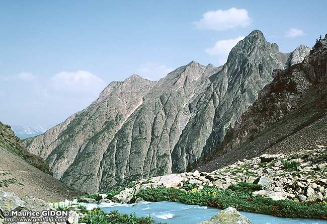inclinée vers l'est, qui surhausse le granite du Combeynot de la rive gauche (nord-orientale) du vallon. C'est le tracé