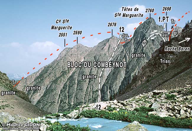 Plus en aval le cours du torrent du Petit Tabuc se coude et devient SW-NE, ce qui lui fait trancher transversalement le massif granitique du Combeynot. La voûte de ce bloc de socle cristallin culmine en rive sud aux Têtes de Sainte-Marguerite. Le prolongement méridional de la faille du Petit Tabuc s'y reconnaît dans la gerbe des cassures NNW-SSE, à pendage subvertical, qui hâchent la crête des Têtes de Sainte-Marguerite et dont la plus occidentale passe par la brèche à l'ouest du point coté 2821 (mais la principale semble être plutôt celle qui passe au collet 2698).