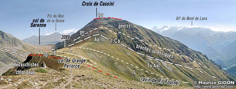 A l'est du col de Grange Pellorce le dernier sommet de ce chaînon est celui de la Croix de Cassini qui est séparé du reste des Grandes Rousses par le col de Sarenne. Il montre une structure assez remarquable par ses particularités. En effet le socle cristallin y est surhaussé par rapport à la couverture sédimentaire de son versant occidental par une cassure, la faille de Cassini, mais celle-ci est masquée par un placage de brèches à éléments parfois volumineux.