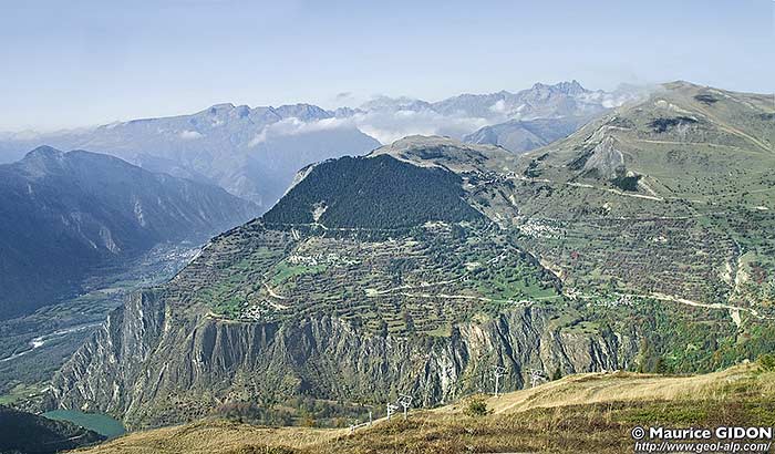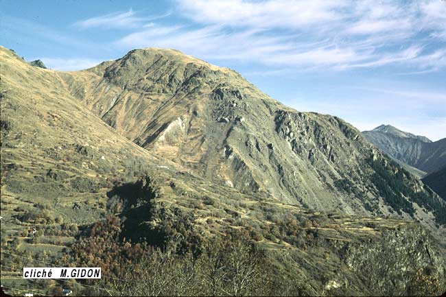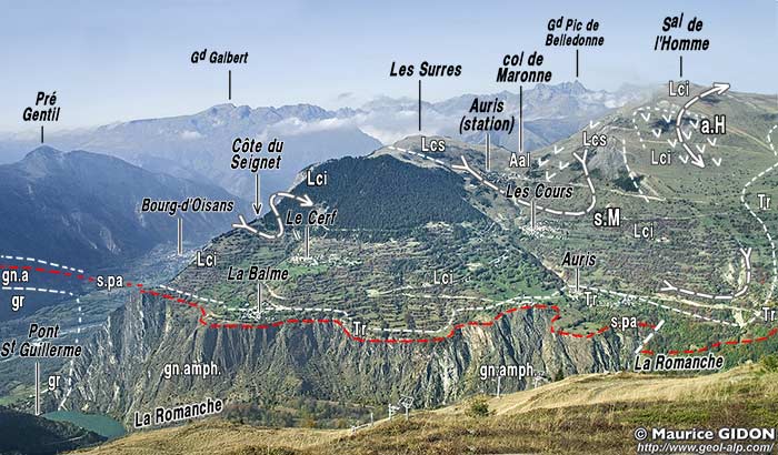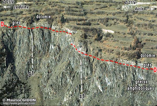 ![]() Le rebord septentrional de la gorge de la Romanche, sous Auris (secteur de la partie centre gauche du cliché précédent), vu du sud, depuis Les Traverses (versant nord de Pied Moutet). La surface de la pénéplaine anté-triasique (D) fait reposer les couches basales (gréseuses) du Trias en discordance* (de près de 90°) sur les gneiss amphiboliques dont la foliation* (s1) avait été redressée pratiquement à la verticale lors de l'orogénèse hercynienne. |