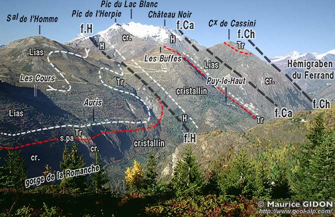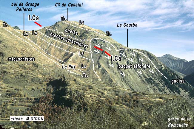 L'extrémité méridionale du massif des Grandes Rousses est tranchée transversalement par les gorges inférieures de La Romanche, entre le Pont Saint-Guillerme et Le-Freney-d'Oisans. Cette profonde entaille permet en particulier de bien y suivre le tracé de l'interface cristallin - sédimentaire et, ainsi, de repérer les accidents N-S qui l'accidentent.