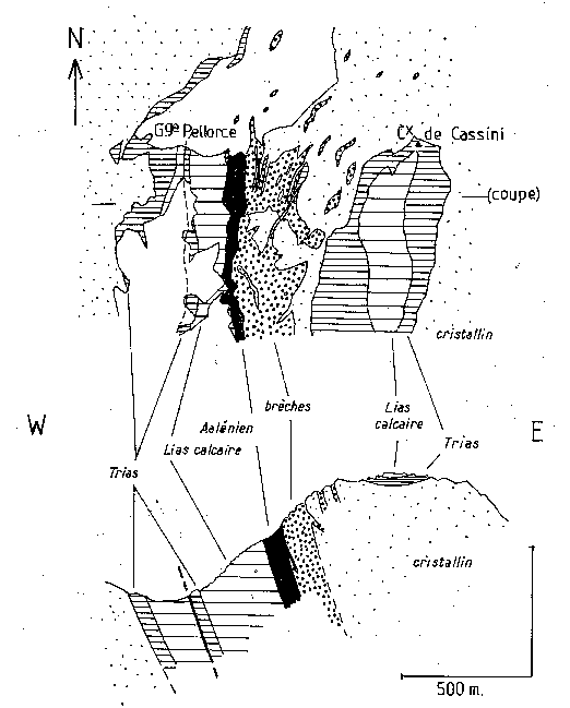 La succession du compartiment effondré est compliquée par une petite imbrication tectonique qui redouble le Trias et la base du Lias. |