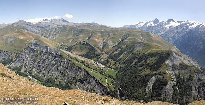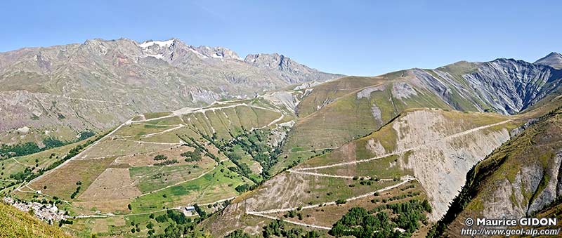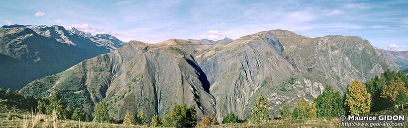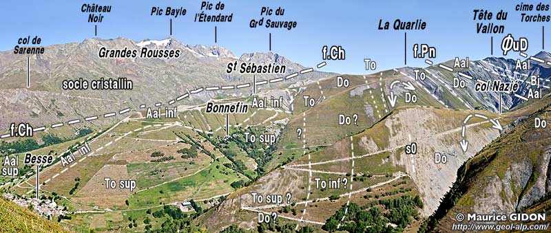 Les deux charnières anticlinales du col Nazié et de la Quarlie sont réellement observables ; elles semblent représenter le prolongement vers le nord de l'anticlinal de la Grande Clapière (voir cliché suivant). Par contre il est moins évident que la bande de Toarcien du versant ouest du col Nazié représente un repli synclinal pincé (ce que laisse penser la carte géologique La Grave).