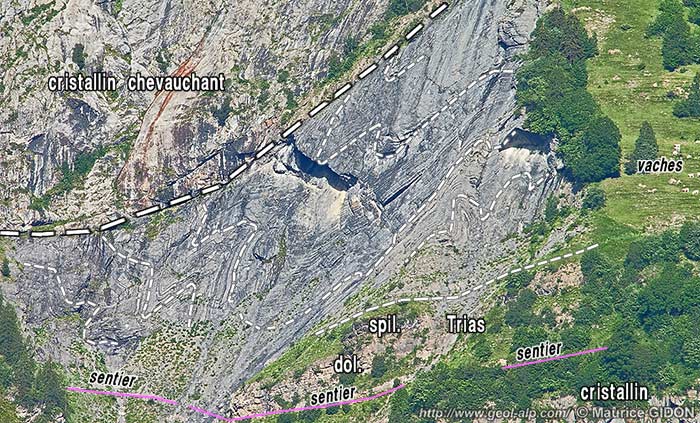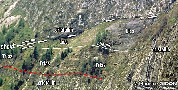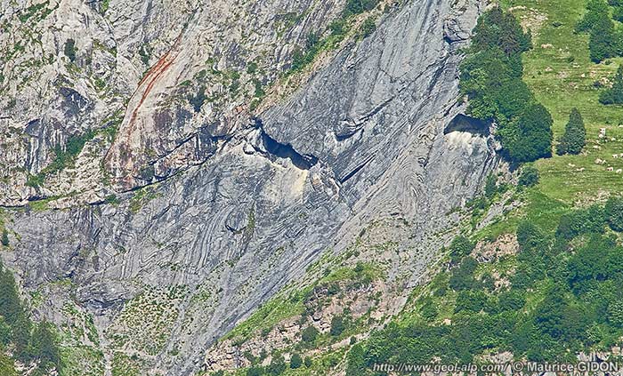 Les couches du Lias calcaire montrent, sous le chevauchement, des plis assez spectaculaires (mais que la perspective ne permet guère d'observer correctement lorsque l'on se trouve sur les lieux) ; ils traduisent évidemment un effet d'entrainement des couches et sont dysharmoniques* par rapport à celles du Trias sous-jacent (non plissé).