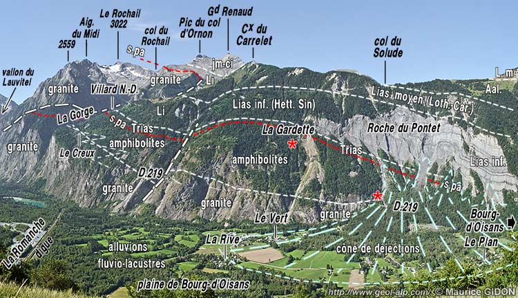 Au sud de Bourg-d'Oisans les pentes occidentales de la vallée de la Romanche montrent de plus en plus largement le socle cristallin, qui est caché plus au nord sous sa couverture sédimentaire. Cela est dû à ce que sa surface supérieure (surface de la pénéplaine anté-triasique) s'élève doucement et régulièrement vers le sud. Ces affleurements du socle cristallin déterminent un puissant abrupt que la route menant à Villard-Notre-Dame traverse en s'élevant à flanc de versant par d'impressionnants encorbellements. L'épaulement sommital de cet abrupt ne correspond pas au rebord supérieur de l'auge glaciaire de la vallée de la Romanche mais plutôt à la limite supérieure du pluton* granitique du Rochail.