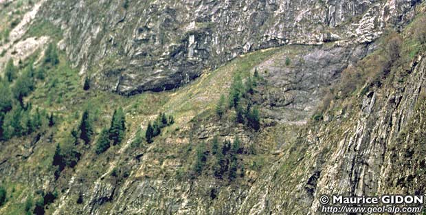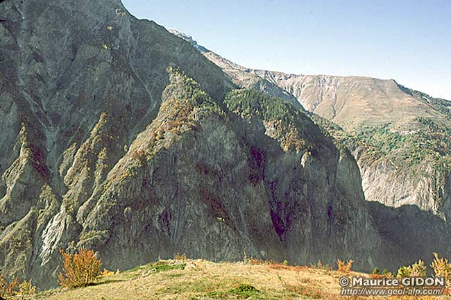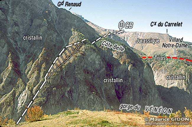 ![]() Coupe du versant oriental du Grand Renaud (pentes de Villard-Notre-Dame) Ø1 = chevauchement de Pierre Grosse ; Ø2 = chevauchement de Côte Belle - Villard-Notre-Dame. |