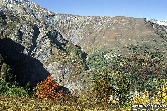 Les couches sédimentaires du versant qui s'élève en amont du village sont assez violemment plissées, comme on peut le voir dans les ravines du bassin de réception du torrent du Villard, au sud des pentes où serpente le chemin de la Croix du Carrelet. Il faut toutefois monter sur ces pentes pour voir ces plis plus selon leur axe et mieux comprendre leur disposition (voir la page "Grand Renaud Est").