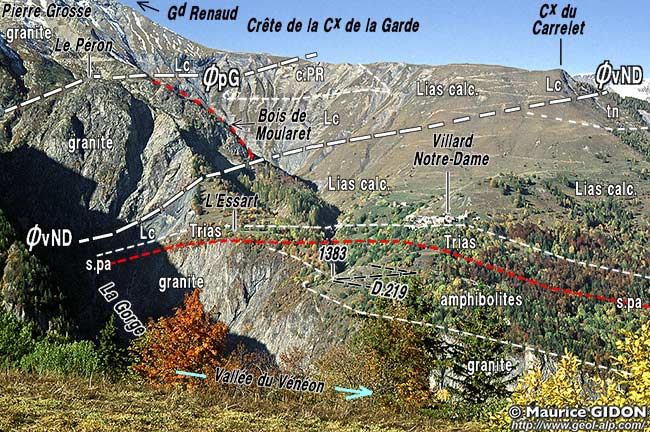 Au sud du village, en rive opposée du grand ravin du Villard, la limite socle-couverture gagne brutalement en altitude. En effet le socle cristallin y réapparaît au dessus de la cote 1650, dans le Bois de Moularet, dont la pente est une dalle structurale orientée presque E-W, formée par la surface supérieure du cristallin, que garnit un placage de dolomies triasiques (au fond du ravin ces couches sont recouvertes stratigraphiquement par les calcaires du Lias qui affleurent en rive gauche). Ce décalage vertical de plus de 100m est occasionné par une faille inverse à vergence* nord, le chevauchement de Villard-Notre-Dame, dont le tracé traverse les pentes du Péron, en diagonale descendante vers le sud, jusqu'à rejoindre le cours inférieur du torrent du vallon des Sources.
