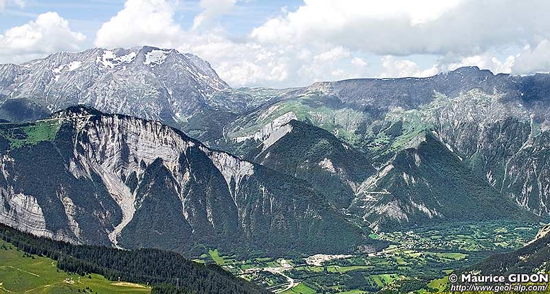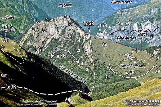 ![]() Schéma interprétatif La dépression de Villard-Reymond est fermée du côté sud par les crêtes du Grand Renaud, qui sont formées de Jurassique supérieur et de Crétacé inférieur. Cela est dû simplement à ce que l'érosion y a moins creusé et donc respecté ces terrains, qui étaient présents aussi plus au nord avant qu'elle n'y affouille le synclinal jusqu'au Lias à partir de la latitude de Villard-Reymond. |