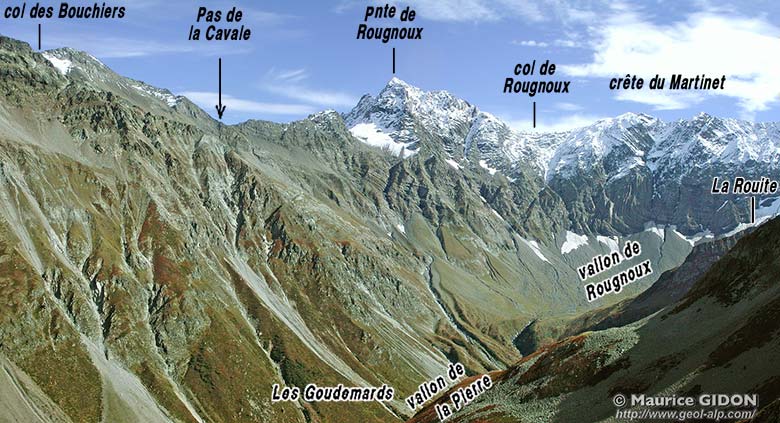 Du côté oriental ce vallon des Rougnoux se ferme au pied de la barrière des crêtes de Rougnoux, de la Cavale et des Bouchiers : cette dernière coupe la communication vers le nord, de l'autre côté du col des Bouchiers, avec le vallon de la Selle où se prolonge la frontière orientale du massif cristallin (le col de la Cavale communique quant à lui avec la vallée du Fournel qui, orientée W-E, s'inscrit en plein dans les couches du flysch nummulitique de la couverture orientale du massif).
