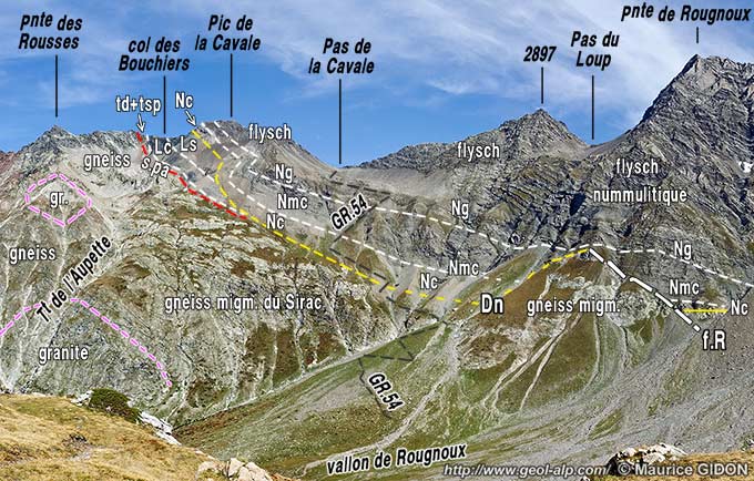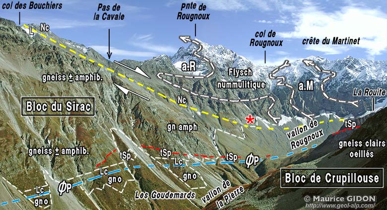 Au sud du vallon de Rougnoux ce même bloc de socle cristallin "du Sirac" forme la plus grande partie de l'arête qui s'élève depuis le col du Cheval de Bois en direction de la Pointe des Estaris, sommet sous lequel le Nummulitique repose, là encore normalement, sur ces gneiss en débutant par ses couches de base ordinaires.