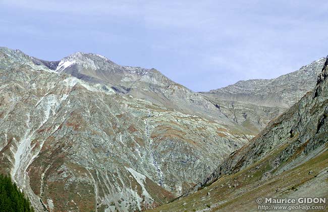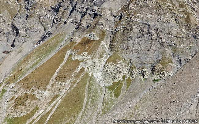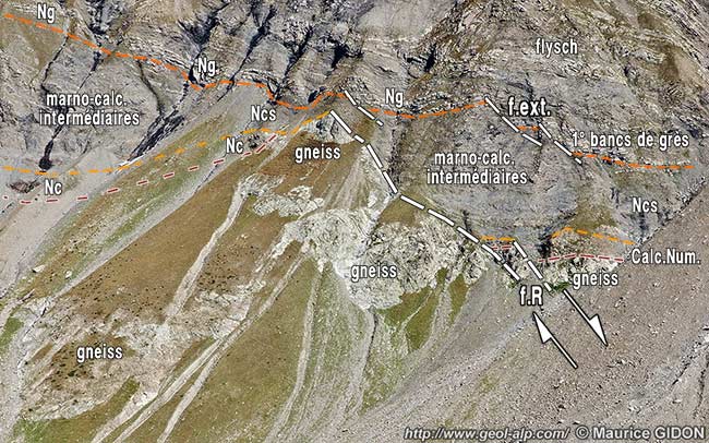 Sous le Pas de la Cavale on voit la surface du socle cristallin de ce bloc se dénuder des témoins de couches mésozoïques qui le garnissent encore au niveau des crêtes et s'enfoncer vers le sud-est, directement recouvert par la surface de transgression* des couches du Nummulitique. Contrairement à ce qu'indique la carte géologique (feuille Orcières) le flysch nummulitique n'est pas séparé de son soubassement cristallin par une surface de contact tectonique, mais le recouvre en contact sédimentaire transgressif par l'intermédiaire de ses calcaires et marno-calcaires (= "schistes à globigérines") de base.