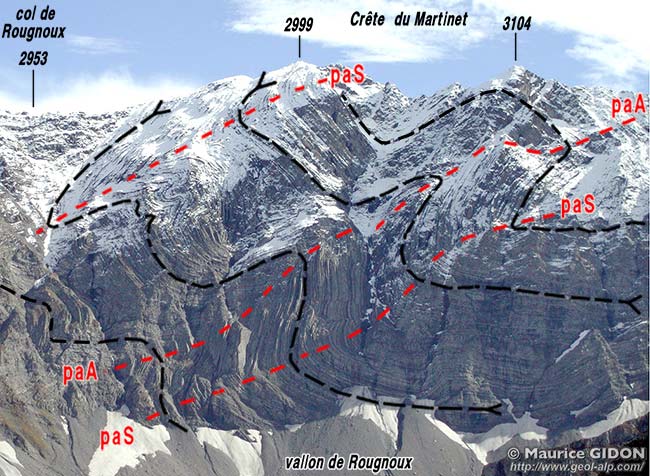 Les abrupts qui ferment le vallon des Rougnoux vers le SE donnent enfin une coupe naturelle qui montre splendidement les plis qui sont dessinés par les bancs du flysch nummulitique (la coupe est touteois un peu oblique à l'axe de ces plis).