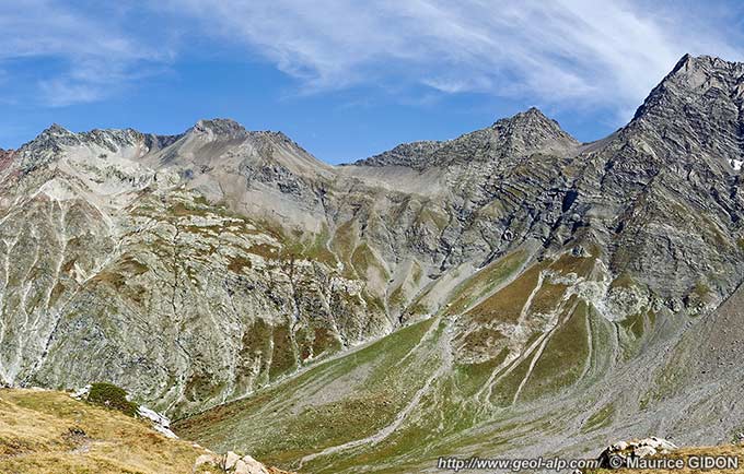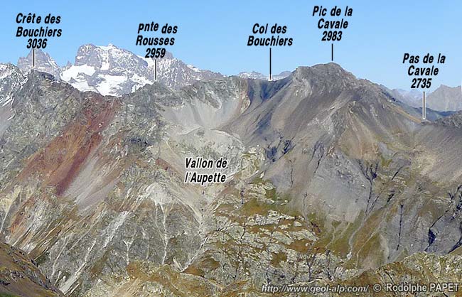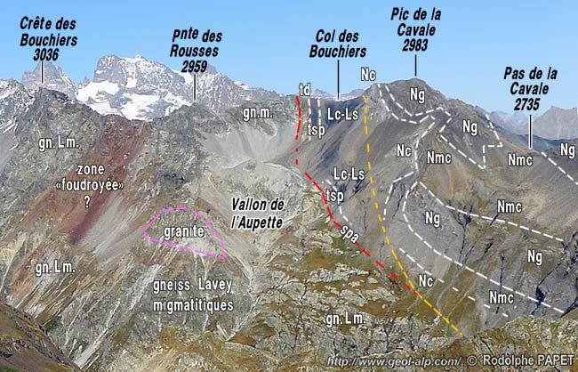À l'ouest du col des Bouchiers le socle cristallin est constitué par des gneiss plus ou moins amphiboliques, du type Lavey mais fortement migmatisés. Ils constituent toutes les crêtes du chaînon qui mène, en passant par la pointe de Verdonne, jusqu'au sommet du Sirac. Dans la pente du vallon de l'Aupette il y a toutes apparence que le Trias (essentiellement représenté par ses spilites) repose en continuité stratigraphique sur le socle cristallin ; aucune trace de faille n'est observable dans ce versant.