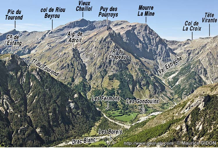 l'ouest, dans l'entaille du Riou Beyrou, symétrique par rapport au sommet du Chaillol (voir le schéma ci-après) : dans les deux cas ces couches ont été recouvertes par le socle cristallin lors de la formation du chevauchement du Chaillol, lequel est grossièrement dirigé vers le sud.