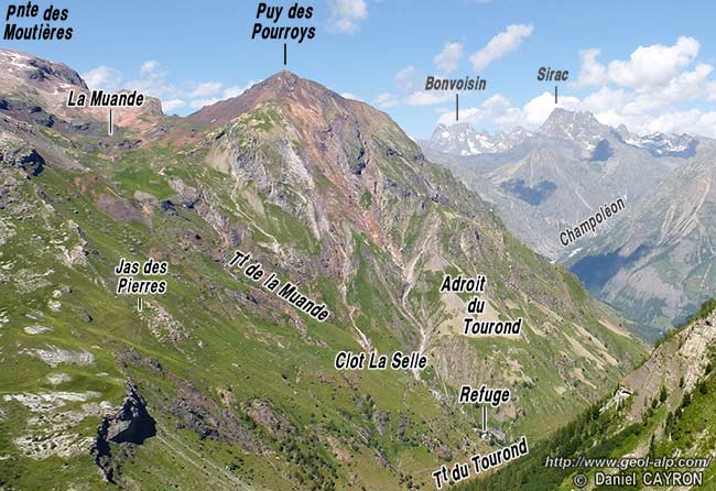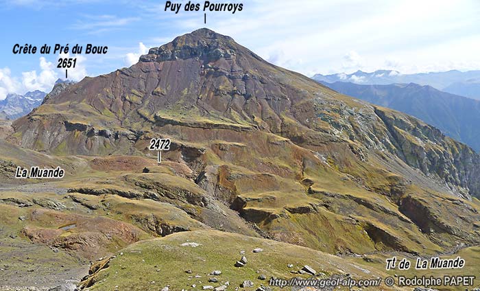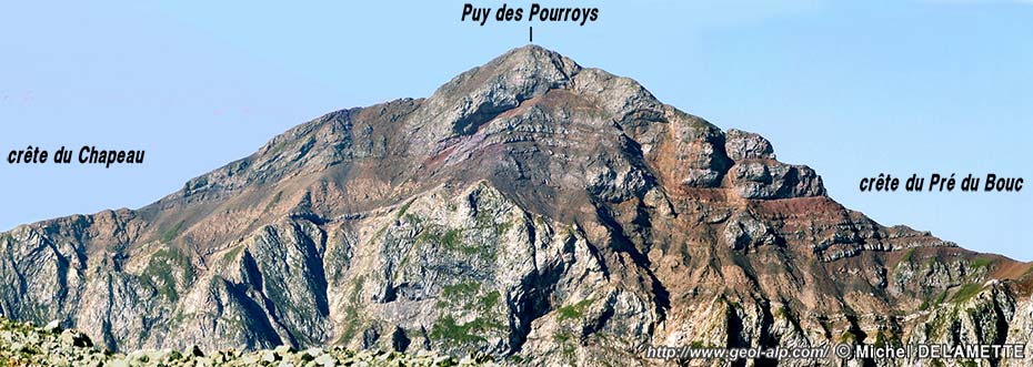 Les abrupts nord-orientaux du Puy des Pourroys, vus depuis les abords des lacs de Crupillouse (cliché original obligeamment communiqué par Mr. M. Delamette).
