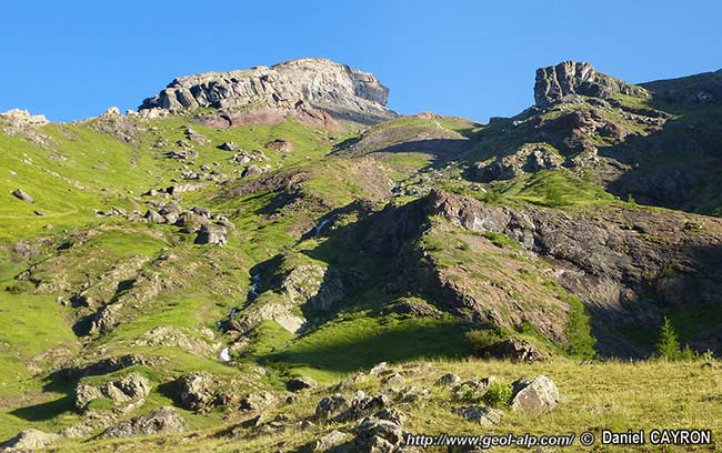 Ensemble des affleurements, en amont de la boutonnière de socle cristallin que le torrent a ouverte pratiquement à la charnière de la torsion anticlinale. Les lits de pélites et de dolomies alternent avec des bancs de spilites. À cette altitude, relativement basse, le pendage des couches et de la surface de la pénéplaine anté-triasique (en rouge), pratiquement conforme à la pente topographique, est encore modéré ; il s'accroît encore plus bas dans le versant (refuge du Tourond).