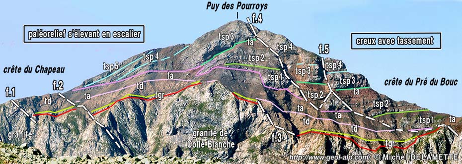 Les coulées successives de spilites ("tsp") s'appuient en onlap progressant de droite à gauche sur la surface des argilites ("ta" : trait rose vif) qui devait donc se surélever progressivement. Le failles f.1, f.2 et f.3