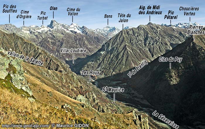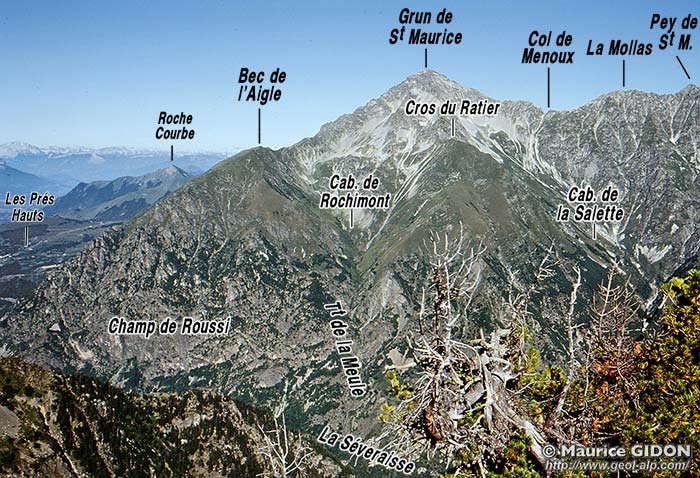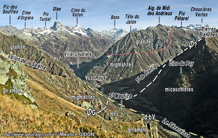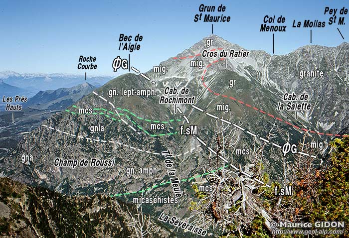 À l'ouest de Saint-Maurice la rive droite de la Séveraysse est dominée par les escarpements cristallins du Grun de Saint-Maurice. Un chapeau de granite y coiffe les amphibolites et micaschistes de la "série corticale" (voir la page "roches cristallines") qui affleurent en bas de versant jusque là où la vallée débouche hors du massif cristallin. L'examen de leurs rapports montre que le granite et les migmatites qui le frangent sont vraisemblablement renversés et recouvrent par chevauchement la succession replissée de la série corticale.