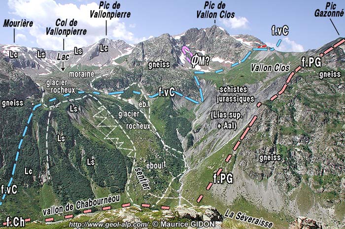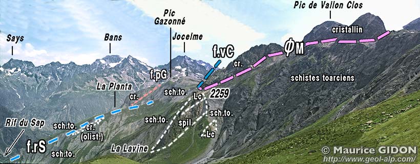 En fait lorsque la faille de Vallon Clos franchit la crête nord du Pic de Vallon Clos il apparaît qu'elle tranche, dans le versant NW de ce dernier sommet, la lame de gneiss du chevauchement de l'Aiguille de Morges et que la surface de ce chevauchement, qui a un pendage est beaucoup moins fort, se rebrousse en synclinal au point de sembler se raccorder avec elle (voir la première photo de cette page). Certes, au delà en direction du NW, son tracé semble s'aligner avec celui jalonné par les olistolites de La Planta, ce qui suggère qu'elle pourrait se poursuivre plus au nord par la faille du Rif du Sap. Cependant on n'observe sur le terrain aucun indice très probant d'un prolongement réel dans cette direction, tandis que son raccord avec la surface de chevauchement de Morges paraît plus convaincant.