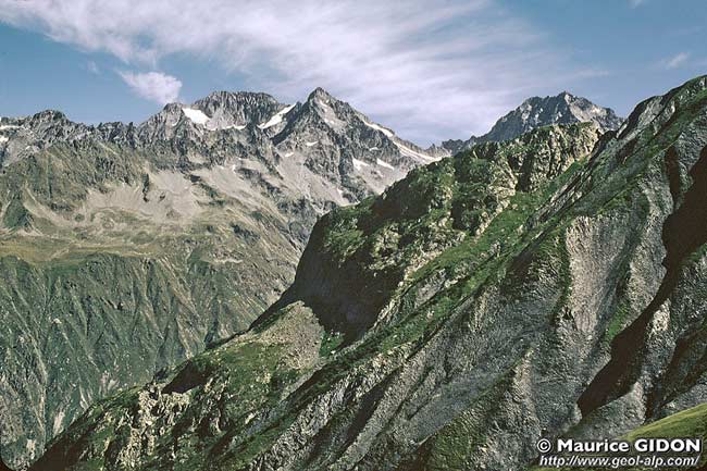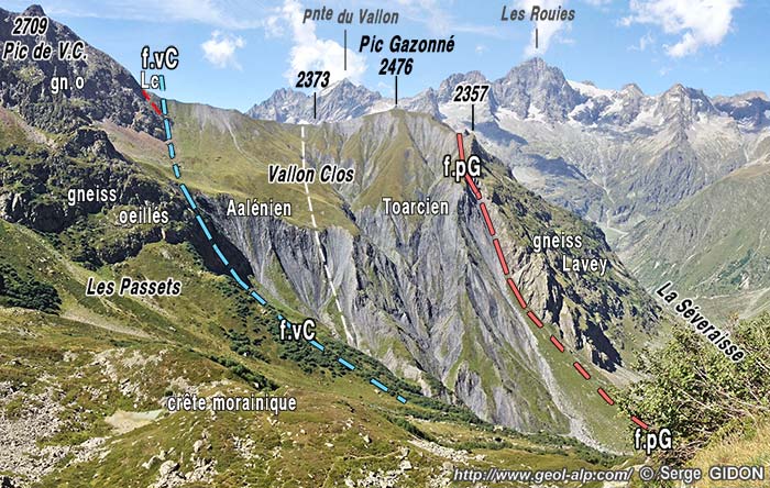Par ailleurs ces deux dernières failles appartiennent en fait à une famille de cassures qui recoupent le cristallin du bord nord du synclinal et y déterminent des entailles qui ont été utilisées par les torrents qui descendent de la rive gauche de la Séveraisse. Elle se poursuivent sur la rive opposée (nord) de la Séveraisse, où l'une d'entre elles, la faille du Rif du Sap est jalonnée par des affleurements de Trias que l'on suit, depuis le hameau du Rif du Sap, jusqu'au petit cirque de La Muande (cette bande de pélites, de marbres et de dolomies, redressés à la verticale, était anciennement dénommée le "filon" du Rif du Sap). Le tracé exact du prolongement de la faille du Pic Gazonné elle-même, au nord de la Séveraisse est également jalonné par un petit affleurement de Trias qui s'y trouve pincé. Il est par ailleurs très évident que cette faille s'y raccorde, par le Lac des Rouies à l'accident N-S majeur qu'est la Faille orientale des Fétoules. |
