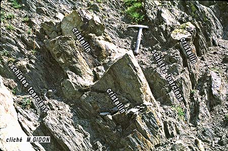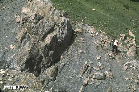 Il est en fait probable qu'il s'agit là d'une paléofaille car ce dispositif semble correspondre à un alignement d'olistolites* au sein de schistes toarciens, parents de ceux que l'on trouve dans ce secteur à divers niveaux des schistes jurassiques (ils sont localisés par un astérisque rouge sur la première photo de la présente page et quelques exemples en sont représentés à la fin de cette page) .