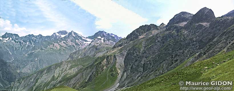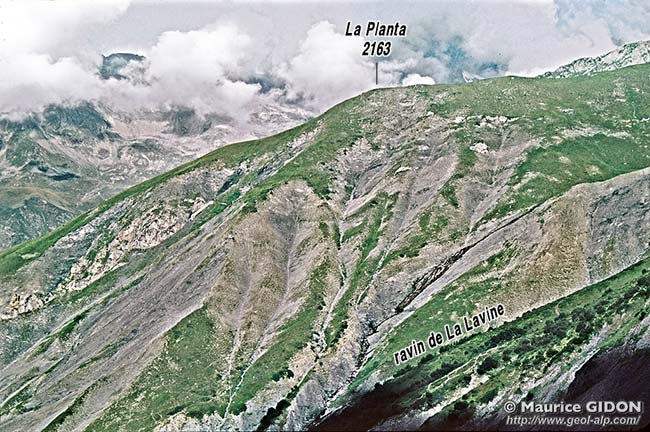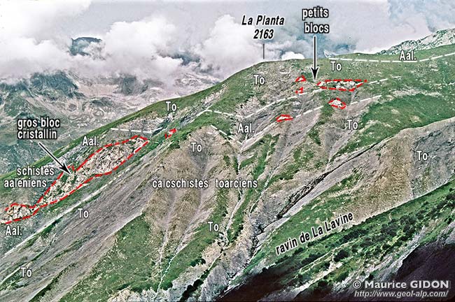 Par ailleurs les pentes du grand vallon de La Lavine montrent en plusieurs endroits des olistolites* de tailles variées, à divers niveaux des schistes jurassiques (ce qui témoigne de l'effondrement d'abrupts voisins pendant la sédimentation). Ils sont localisés par un astérisque rouge sur la première photo de la présente page. On trouvera ci-après deux vues plus rapprochées des olistolites des pentes supérieures de rive gauche du vallon de La Lavine.