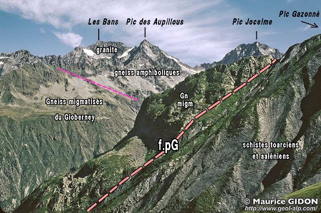 À l'extrémité orientale de ce versant de la montagne, les couches du Lias moyen ou supérieur, voire du Dogger (Aalénien), qui affleurent sous le chevauchement s'appuient directement contre un mur cristallin subvertical. Cela correspond à une importante cassure, la faille du Pic Gazonné, qui est orientée NW-SE et relève de plusieurs centaines de mètres son compartiment oriental.