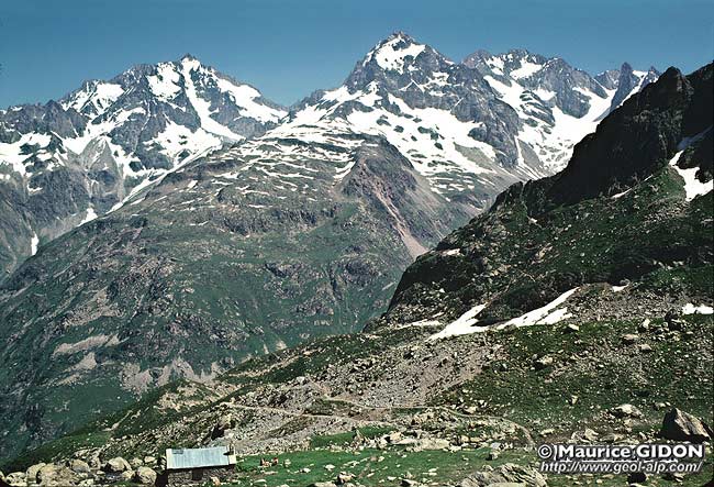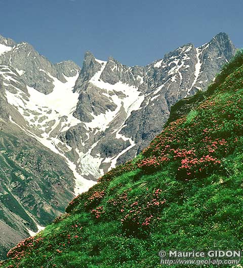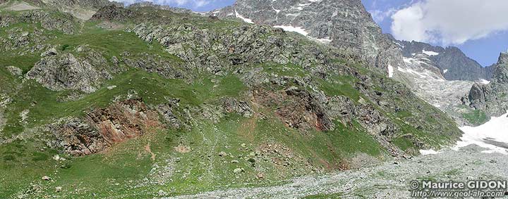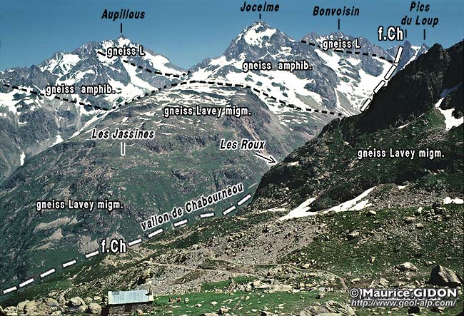 Sur le versant opposé de la crête de partage de eaux entre Vallouise et Valgaudemar les gneiss amphiboliques apparaissent en une sorte de demi coupole qui s'enfonce vers le sud sous ceux du type Lavey.